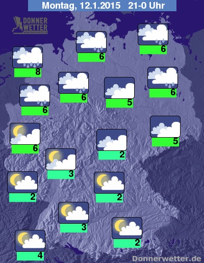Heute Abend kann die Bewölkung im Süden und Südwesten häufig auflockern, dazu bleibt es hier trocken, weiter nach Norden hin bleiben die Wolken dagegen verbreitet dicht und im Norden fällt dazu zeitweise Regen, sonst bleibt es meist trocken. Die Abendtemperatur liegt bei 8 Grad an der Nordsee und bei 2 Grad am Alpenrand. Der Wind weht frisch bis stark mit teils stürmischen Böen, ganz vereinzelt auch noch mit Sturmböen. An der See und auf den Hochlagen der Mittelgebirge ist es oft stürmisch, dabei sind schwere Sturmböen möglich.