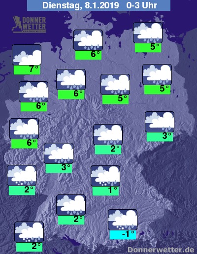 In der Nacht auf Dienstag dominiert weiterhin eine geschlossene Wolkendecke das Land, regionale Auflockerungen sind im Verlauf im Ostseeumfeld sowie im Münsterland möglich. Verbreitet fällt in der Nacht zum Teil kräftiger Regen, südlich des Mains können die Niederschläge auch als Schneeregen oder Schnee fallen.