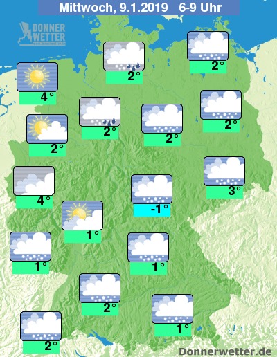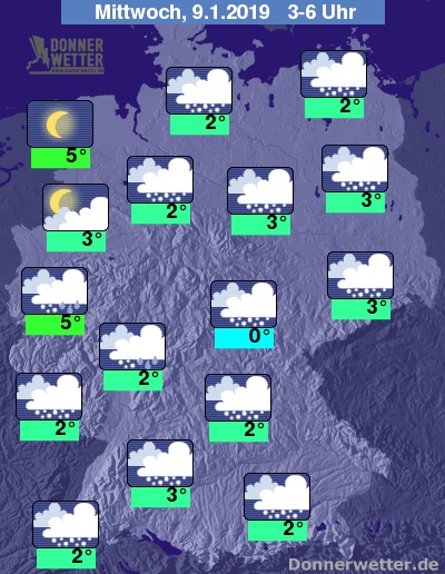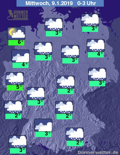 In den Nachtstunden bleibt der Himmel weitgehend stark bewölkt oder bedeckt, einzelne Wolkenlücken sind meist nur im äußersten Nordwesten zu erwarten. An der Nordseeküste kann es im Verlauf auch phasenweise aufklaren. Verbreitet muss in der Nacht bis in tiefe Lagen mit Schneefällen, im Westen und Südwesten auch Schneeregen oder Regen gerechnet werden. Örtlich besteht Glättegefahr! Zudem weht weiterhin ein starker bis stürmischer Wind, auf den Bergen können auch orkanartige Böen auftreten.