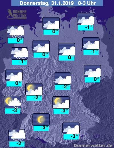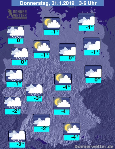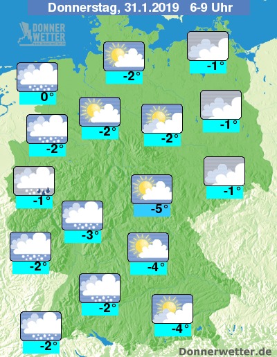 Die Temperaturen erreichen Werte um -5 Grad C im Thüringer Wald und um 0 Grad C im Emden.