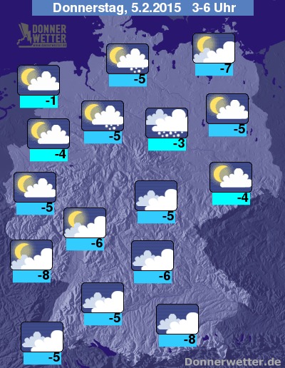 In der Nacht zum Donnerstag ziehen vom Norden bis zur Mitte Deutschlands oft dichte Wolken durch, die für zeitweilige Schneefälle sorgen können, auch im Süden halten sich verbreitet dichte Wolken, dabei fällt jedoch nur gelegentlich Schnee. In den anderen Regionen ist es hingegen häufig locker oder aufgelockert bewölkt und es bleibt weitgehend trocken. Die Tiefstwerte liegen zwischen -1 Grad an der Wesermündung und -8 Grad in Landshut.