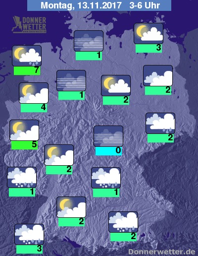 In der kommenden Nacht fällt vor allem im Süden, aber auch im Osten gebietsweise Regen, Schneeregen oder Schnee, sonst ist es oft locker bis aufgelockert und zumeist trocken. Im Nordseeumfeld ist es oft stark bewölkt und es bilden sich hier einzelne Schauer. Die Temperatur sinkt auf 7 Grad in Wilhelmshaven und bis 0 Grad im Thüringer Becken. Es besteht zum Teil Straßenglätte durch Schnee oder überfrierende Nässe!