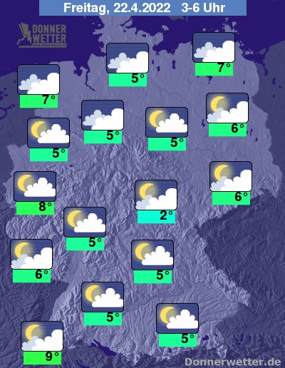 In der Nacht zum Freitag ist es im Westen und Süden meist nur locker, im übrigen Land aufgelockert bis stark bewölkt, dazu bleibt es bundesweit trocken. Die Temperatur sinkt auf 9 Grad in Freiburg und bis 2 Grad in Jena.