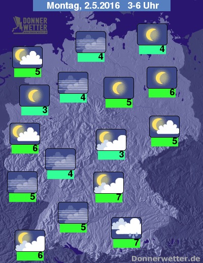 In der Nacht zum Montag fällt am Alpenrand unter dichten Wolken zeitweise Regen, über dem übrigen Süden ist es anfangs verbreitet stark bewölkt, jedoch schon trocken, bis zum Morgen lockert hier die Bewölkung immer weiter auf. Weiter nach Norden hin zeigt sich der Himmel größtenteils sternenklar und sonst nur locker bewölkt. Hier und da bildet sich Dunst oder Nebel, dabei bleibt es trocken. Die Temperatur sinkt auf 7 Grad in Berchtesgaden und auf etwa 3 Grad im Bergischen Land.