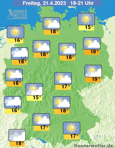 Heute Abend zeigt sich das Wetter über dem Land verbreitet heiter. In den westlichen Landesteilen ziehen allerdings oft auch viele und teils dichte Wolken durch, hier besteht ein leichtes Schauerrisiko, vereinzelte Gewitter sind ebenfalls möglich. Im übrigen Land bleibt es weitgehend trocken bei Werten von 15 Grad in Wiesbaden und rund 19 Grad in Dresden.