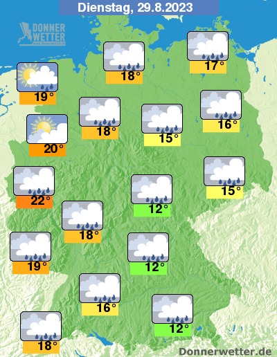 Am Dienstag zeigt sich das Wetter häufig stark bewölkt oder bedeckt, dabei bilden sich gebietsweise Schauer oder es fällt Regen. Im Nordwesten des Landes scheint auch zeitweise die Sonne, hier bleibt es meist trocken. Die Temperatur steigt auf kühle 12 Grad in Oberbayern und bis 22 Grad im Rheinland.