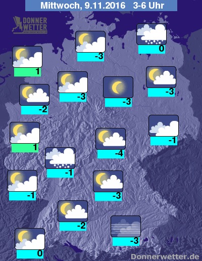 In der kommenden Nacht fällt zunächst im Osten und Nordosten noch zeitweise Regen, Schneeregen oder Schnee, sonst ist es überwiegend leicht oder aufgelockert bewölkt und trocken, bevor gegen Morgen im Westen und Südwesten dichte Wolken mit neuem Regen, Schneeregen und auch Schnee aufziehen, dabei sind glatte Straßen möglich. Die Temperatur sinkt auf 1 Grad am Niederrhein und bis -4 Grad im Thüringer Becken.