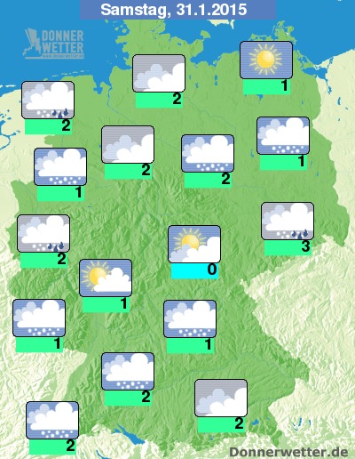 Für das Wochenende stehen die Zeichen momentan auf Winterwetter mit häufigen Schneefällen bis ins Flachland, gebietsweise fällt aber auch Schneeregen oder Regen, bzw. reicht es zwar bis in tiefere Lagen zu Nassschnee, dieser kann sich jedoch häufig nicht halten. Nur hin und wieder kann sich zwischen den meist dichten Wolken die Sonne zeigen. Die Höchstwerte liegen sowohl am Samstag als auch am Samstag bei 0 bis 3 Grad.