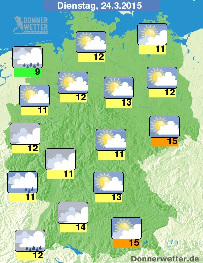 Am Dienstag ist es zunächst verbreitet heiter oder aufgelockert bewölkt und dazu trocken. Am Nachmittag ziehen jedoch vor allem nach Westen hin oft dichte Wolken auf, die besonders in den westlichsten Landesteilen auch gebietsweise Regen bringen können. Nach Osten hin bleibt es hingegen trotz zunehmender Bewölkung weitgehend trocken. Die Temperatur steigt auf 9 Grad an der Nordseeküste und bis 15 Grad in Dresden und München.