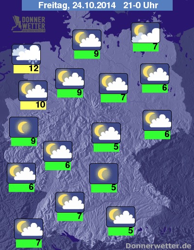 Heute Abend zieht meist nur lockere Bewölkung übers Land, gebietsweise ist es sternenklar, Richtung Nordsee kann jedoch bei teils dichten Wolken hier und da etwas Regen fallen, sonst bleibt es trocken. Im Süden kann sich örtlich Nebel oder Hochnebel bilden. Die Abendtemperaturen liegen zwischen 12 Grad an der Nordseeküste und örtlich 4 Grad am Bayerischen Wald.