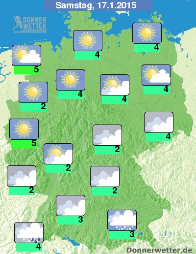 Am Samstag halten sich vor allem im Süden und Osten oft dichte Wolken, aus denen vor allem am Alpenrand zeitweise Schnee oder Schneeregen fallen kann. Die Nordwesthälfte dagegen erwartet einen überwiegend freundlichen und trockenen Tag mit häufigem Sonnenschein. Die Temperaturen liegen jedoch nur noch bei 2 bis 5 Grad.