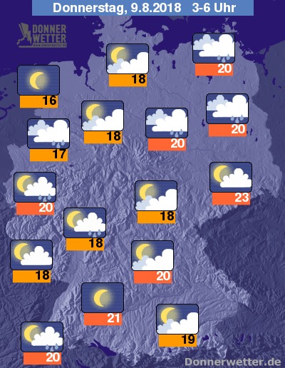 In der bevorstehenden Nacht können sich im gesamten Bundesgebiet gebietsweise Schauer und auch zum Teil kräftige Gewitter entwickeln, dazwischen kann der Himmel aber auch immer wieder auflockern oder sogar aufklaren. Die Temperatur sinkt auf tropische 23 Grad in Dresden und bis auf etwa 16 Grad in Bremerhaven.