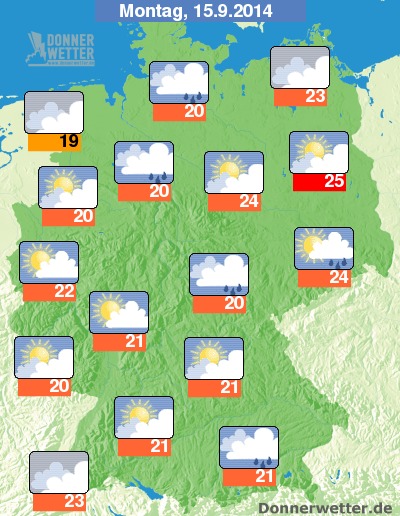 Der Wochenstart verläuft im Norden und Osten, sowie in der Mitte des Landes meist verhalten, hier bilden sich am Tage gebietsweise Schauer und auch einzelne Gewitter. Auch im Süden ist es häufig stark bewölkt, Regen fällt dabei aber kaum. Freundlich mit mehr Sonnenschein und trocken ist es vom südwestlichen Niedersachsen, über NRW, Hessen, Rheinland-Pfalz bis ins Saarland. Die Temperatur steigt auf 19 Grad in Ostfriesland und bis 25 Grad in Berlin.