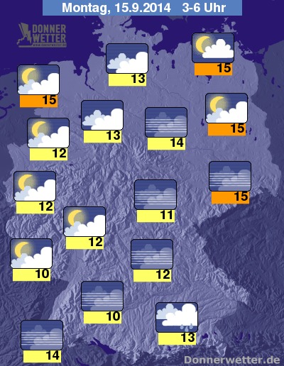 In der kommenden Nacht bleibt der Himmel verbreitet locker bewölkt, gebietsweise zeigt er sich auch sternenklar, dazu bleibt es meist trocken. Es kann sich jedoch stellenweise Nebel oder Dunst ausbilden. Die Temperatur sinkt auf rund 15 Grad an der Müritz und etwa 10 Grad an der Schwäbischen Alb.