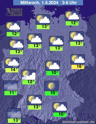 In der Nacht auf Mittwoch bleibt der Himmel über dem dem Westen und Südwesten wolkig, dabei können lokale Schauer und Gewitter nicht ausgeschlossen werden. In den übrigen Landesteilen bleibt es bei geringer Bewölkung oder sternenklarem Himmel niederschlagsfrei.