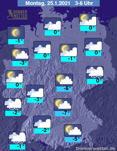 In der Nacht zum Montag fällt im Süden und Osten gebietsweise Schnee, teils auch Schneeregen. Im übrigen Land ist es teils stark bewölkt, oft aber auch locker bis aufgelockert bewölkt, dazu bleibt es meist trocken. Stellenweise bildet sich Nebel. Die Temperatur sinkt auf 0 Grad an der Ostsee und bis -7 Grad in Mittelfranken.