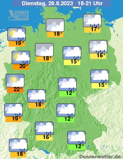 Heute Abend fällt unter dichten Wolken vor allem über der Osthälfte des Landes zeitweise Regen, im Südwesten bilden sich gebietsweise Schauer. Im übrigen Land ist es auch oft stark, vor allem im Nordwesten auch aufgelockert bewölkt, dazu bleibt es meist trocken. Die Temperatur liegt bei 12 Grad in Franken und 22 Grad im Rheinland.