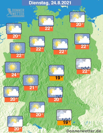 Am Dienstag zeigt sich das Wetter verbreitet heiter bis sonnig, im Süden und Osten ziehen jedoch oft einige, im Süden auch kompakte Wolken durch, hier bilden sich einzelne Schauer. Im übrigen Land bleibt es dagegen landesweit trocken. Die Temperatur steigt auf 19 Grad in Jena und bis 24 Grad in Köln.