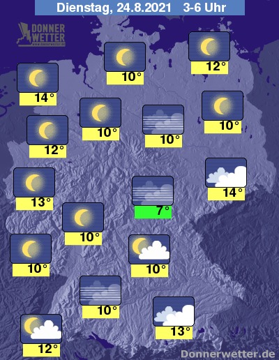 In der kommenden Nacht bringen dichte Wolken am Alpenrand hier und da noch weiteren Regen. Im übrigen Bayern und Sachsen bleibt  es bis zum Morgen auch oft stark bewölkt, jedoch weitgehend trocken. Im übrigen Land ist der Himmel meist sternenklar oder es ziehen nur wenige Wolken durch, dazu bleibt es trocken. Die Temperatur sinkt auf 14 Grad an der Nordsee und bis 7 Grad im Eichsfeld.