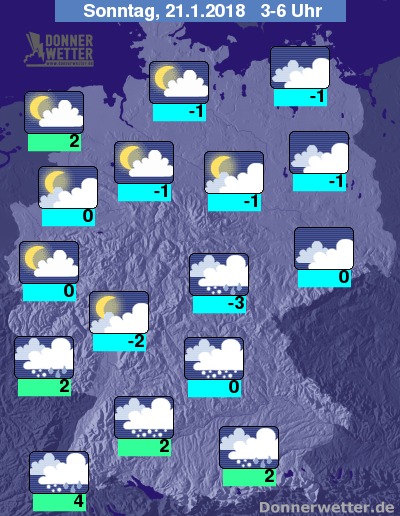 Am Sonntag kann sich im Osten und Nordosten zeitweise die Sonne zeigen, hier bleibt es trocken. Im Süden und Südwesten ziehen dagegen dichte Wolken mit Regen, Schneeregen oder Schnee durch, sonst bleibt es zwar meist stark bewölkt, jedoch auch weitgehend trocken. Die Temperatur erreicht 0 Grad an der Müritz und bis 6 Grad im Breisgau.