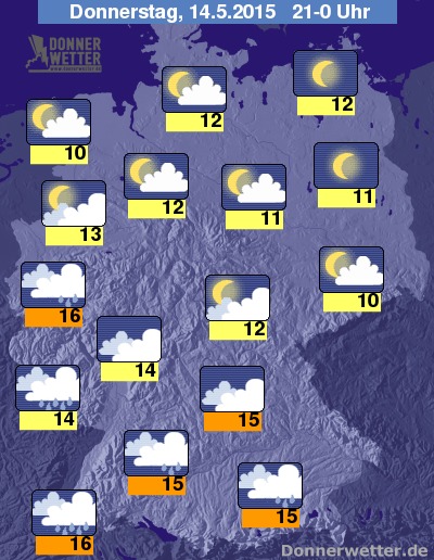 Heute Abend ziehen von Südwesten her dichte Regenwolken auf, dabei fällt besonders im Südwesten teils langanhaltender und ergiebiger Regen, er breitet sich bis Mitternacht etwa zu einer Linie vom südlichen NRW bis zum Allgäu hin aus. Nordöstlich dieser Linie anschließend ist es ebenfalls zunehmend bewölkt, aber noch trocken. Verbreitet sternenklar oder nur locker bewölkt und dabei trocken bleibt es im Norden und Osten des Landes. Die Abendtemperatur liegt bei 16 Grad im Breisgau und etwa 10 Grad in Niederschlesien.
