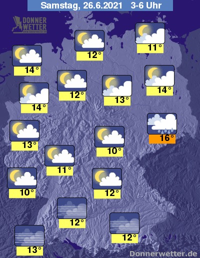 In der Nacht zum Samstag zeigt sich der Himmel überwiegend locker bewölkt. Besonders im Süden ist es meist sternenklar. Dagegen können über Sachsen gebietsweise dichte Wolken auch einzelne Schauer bringen, sonst bleibt es trocken. Die Temperatur sinkt auf 16 Grad in der Lausitz und bis 10 Grad im Saargau.