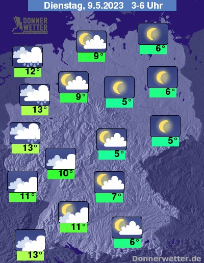 In der Nacht zum Dienstag halten sich über den westlichen Landesteilen dichte Wolken und entlang von Mittel- bis zum Niederrhein und zur Nordsee können sich einzelne Schauer bilden. Über der Osthälfte der Republik zeigt sich der Himmel dagegen locker bewölkt bis sternenklar, dazu bleibt es trocken. Die Temperatur sinkt auf 13 Grad am Rhein und bis 5 Grad an der Neiße.