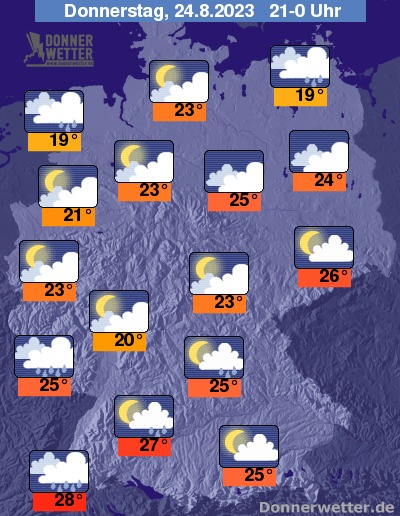 In den Abendstunden ist der Himmel über dem Westen, Nordwesten und Südwesten zumeist stark bewölkt oder bedeckt, dabei muss immer wieder mit Schauern und Gewittern gerechnet werden. In den übrigen Landesteilen bleibt es bei einem Mix aus Sonne und wechselnder Bewölkung meist trocken.