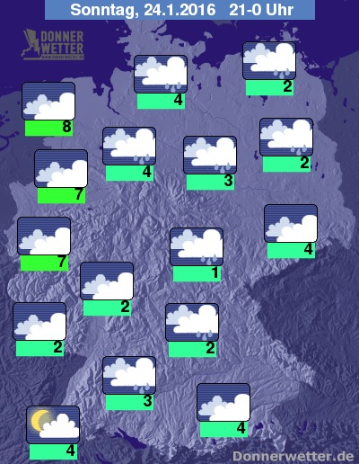 Heute Abend halten sich praktisch landesweit dichte Wolken aus denen zeitweise Regen fällt, Auflockerungen sind am ehesten im Südwesten möglich, hier bleibt es auch weitgehend trocken. Nach Westen hin klingen die Niederschläge gegen Mitternacht meist ab, sonst bleibt es aber weiterhin bei zeitweiligem Regen. Die Abendtemperatur liegt bei 8 Grad an der Nordsee und um 1 Grad im Grabfeld.