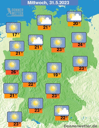 Am Mittwoch zeigt sich das Wetter überwiegend sonnig, nur hier und da kann auch mal lockere Bewölkung durchziehen, dabei bleibt es trocken. Die Temperatur steigt auf 17 Grad in Cuxhaven und bis 26 Grad in Köln.