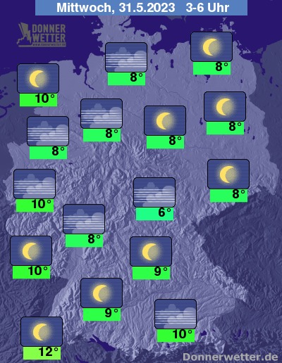 In der Nacht zum Mittwoch ist es anfangs noch teils locker bis aufgelockert, zunehmend aber landesweit nur noch gering bewölkt oder sogar sternenklar. Bei Tiefstwerten von 12 Grad am Oberrhein und 6 Grad am Thüringer Wald bleibt es überall trocken.