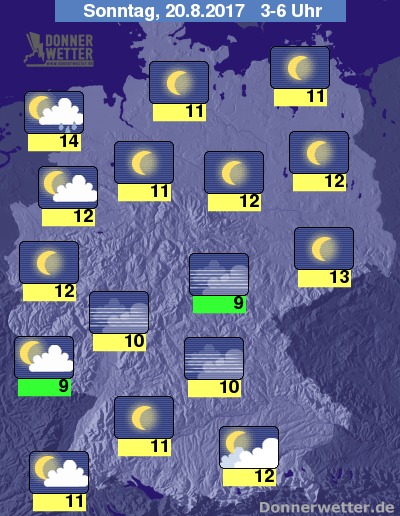 In der Nacht zum Sonntag sind in Nordseenähe noch einzelne Schauer möglich, ansonsten zeigt sich der Himmel über der Republik aber überwiegend sternenklar und sonst locker bewölkt, dabei bleibt es trocken. Die Temperatur sinkt auf Werte zwischen 14 Grad in Emden und bis etwa 9 Grad im Thüringer Becken.