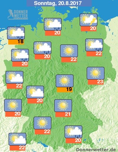Am Sonntag zeigt sich verbreitet heiteres bis sonnig Wetter. Vor allem im Norden, aber auch im äußeren Süden Deutschlands ziehen im Tagesverlauf oft dichte Wolken auf, die hier vielerorts Schauer und lokal auch Gewitter bringen, sonst bleibt es jedoch weitgehend trocken. Die Temperatur steigt auf 18 Grad direkt an der Nordsee und bis 23 Grad in der Lausitz.