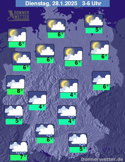 In der Nacht zum Dienstag fällt südlich der Donau noch Regen, an den Alpen auch Schnee. Sonst sind bei wechselnder bis starker Bewölkung nur selten Schauer zu erwarten. Der Wind lässt in der Nacht nach, an der Küste und auf den Gipfeln noch einzelne starke bis stürmische Böen.