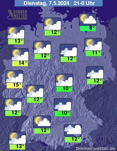 In den Nachmittagsstunden zeigt sich der Himmel überwiegend wechselnd oder stark bewölkt, dabei muss von Westen über die Mitte bis nach Sachsen mit Schauern gerechnet werden, auch einzelne Gewitter sind möglich. Länger anhaltend regnerisch bleibt es auch südlich der Donau. Im Nordwesten und Nordosten bleibt es bei teils auch freundlicheren Abschnitten meist trocken.