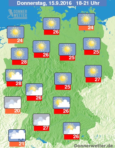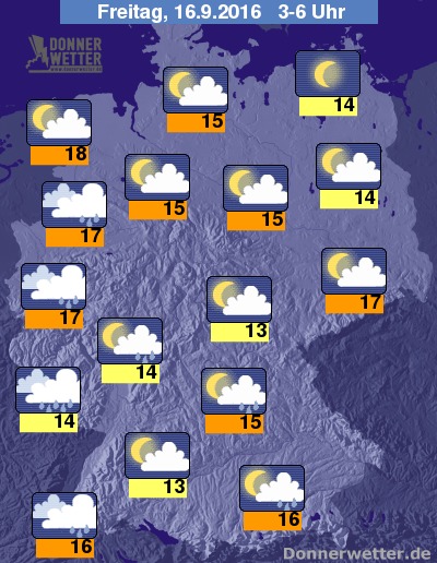 In der Nacht zum Freitag ist es im Norden und Osten anfangs noch sternenklar, im weiteren Verlauf ziehen hier zunehmend auch einige Wolken auf, die jedoch keinen Regen bringen. Über der Südwesthälfte ist es teils locker, gebietsweise aber auch stark bewölkt, dazu können sich hier und da Schauer, selten auch einzelne Gewitter bilden. Die Temperatur sinkt auf 18 Grad im nördlichen Emsland und bis 13 Grad am Odenwald.
