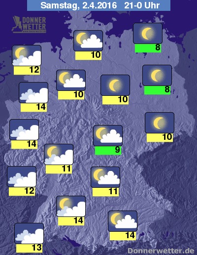 Heute Abend ziehen in die westlichen Landesteile zunehmend auch dichte Wolken, die jedoch noch keinen Regen bringen. Über der Osthälfte der Republik bleibt es hingegen verbreitet leicht bewölkt oder sternenklar, dabei bleibt es ebenso trocken. Die Abendtemperatur liegt bei 14 Grad in Aachen und um etwa 8 Grad an der Müritz.