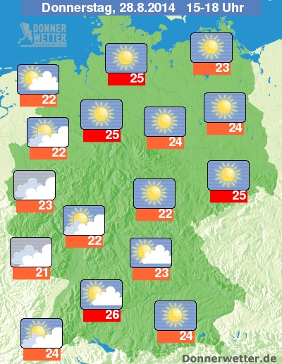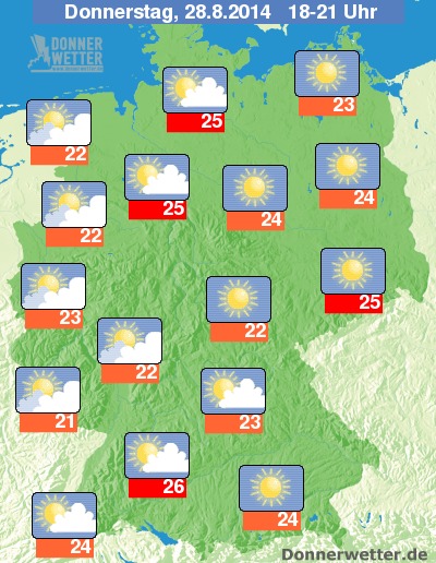 Auch der Abend spendiert dem Nordosten und Osten nochmals eine großzügige Portion Sonne. Hier liegen die Werte regional noch bei sommerlichen 25 Grad C. Weiterhin zwar meist niederschlagsfrei, dafür aber deutlich wolkiger geht es in der Westhälfte Richtung Abend.