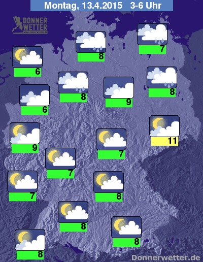 In der Nacht zum Montag zieht das Regenband von Norden bis in den Osten des Landes, dahinter lockert die Bewölkung aber schon wieder auf und es bleibt trocken. In den übrigen Landesteilen bleibt es zumeist locker, teils aufgelockert bewölkt und dabei trocken. Die Temperatur sinkt auf 11 Grad in Dresden und 6 Grad an der Ems. Im Norden weht ein teils starker, im Küstenumfeld auch stürmischer Wind.