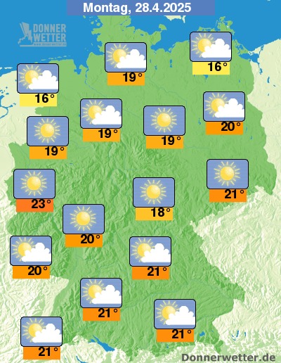 Am Montag können sich an den Alpen, neben heiteren Abschnitten, auch lokal Schauer und Gewitter entwickeln. An den Küsten sind einige Wolken möglich, wobei es hier trocken bleibt. Im übrigen Land ist es hingegen meist sonnig und dazu trocken. Die Höchstwerte liegen bei 16 Grad an den Küsten und bis zu 23 Grad im Raum Köln.