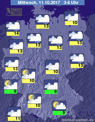 In der folgenden Nacht ziehen kompakte Wolken mit zeitweiligem Regen über den Norden, Nordosten und Osten Deutschlands hinweg. Über der Südwesthälfte der Republik ist es zwar auch teils stark, teils aber aufgelockert bewölkt und dazu bleibt es trocken. Die Temperatur sinkt auf 14 Grad in Wilhelmshaven und bis 9 Grad in Mittelfranken.