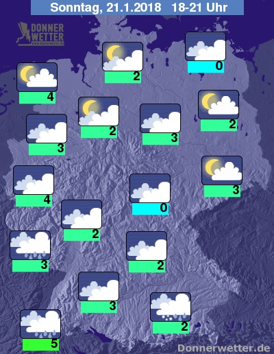 Heute Abend fällt südwestlich einer Linie Köln-München zeitweise Regen, Schneeregen oder Schee. Nordöstlich dieser Linie ist es ebenfalls bedeckt, jedoch trocken. Oft locker bis aufgelockert bewölkt und dazu trocken zeigen sich der Norden und der Osten der Republik. Die Temperatur liegt bei 0 bis 5 Grad.