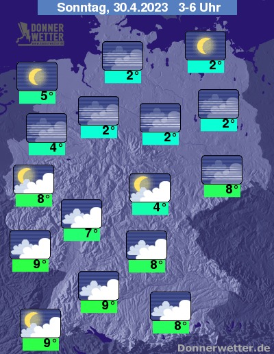 In der folgenden Nacht klart der Himmel im Norden und im weiteren Verlauf über der gesamten Nordhälfte des Landes auf. Weiter nach Süden bleibt es hingegen meist bei dichten Wolken. Bei Tiefstwerten von 9 Grad in Stuttgart und 2 Grad in Hamburg bleibt es landesweit trocken.