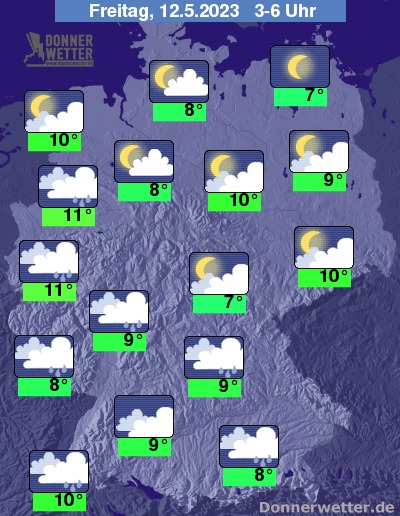 In der bevorstehenden Nacht ist der Himmel über dem Norden und Osten zum Teil aufgelockert, teils auch stark bewölkt, dazu bleibt es trocken. Etwa über der Südwesthälfte bleibt die Wolkendecke verschlossen und es fällt zeitweise Regen. Die Temperatur sinkt auf 11 Grad in Bonn und 7 Grad in Jena.