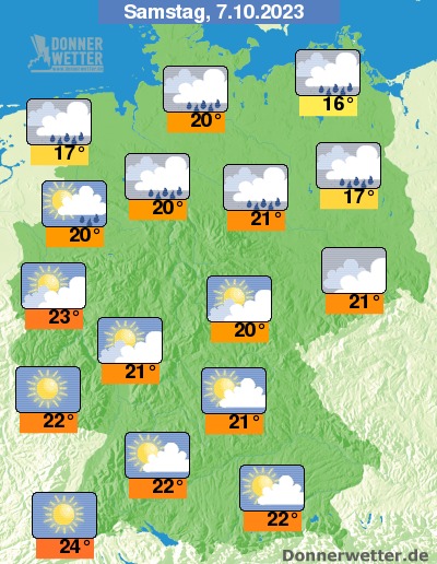 Am Samstag zeigt sich das Wetter über der Südwesthälfte verbreitet heiter oder sonnig, dabei bleibt es trocken. Im Norden, aber auch im Osten halten sich meist dichte Wolken, dazu fällt gebietsweise Regen. Die Temperatur erreicht 16 Grad in Stralsund und bis 24 Grad in Freiburg.
