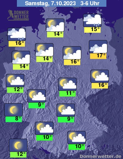 In der Nacht zum Samstag fällt im Norden unter meist dichten Wolken gebietsweise Regen. Über der Südhälfte zeigt sich der Himmel meist locker bewölkt oder sternenklar, hier bleibt es trocken. Die Temperatur sinkt auf 17 Grad in Berlin und 8 Grad in Saarbrücken.