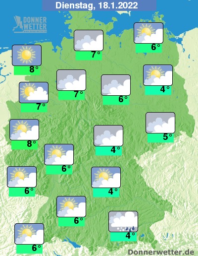 Am Dienstag zeigt sich das Wetter überwiegend dicht bewölkt, teils auch neblig-trüb. Nur hier und da zeigen sich auch mögliche Auflockerungen. Es bleibt mit Ausnahme einzelner Tropfen oder Flocken am Alpenrand landesweit trocken. Die Temperatur steigt auf 4 Grad in München und bis 8 Grad in Köln.