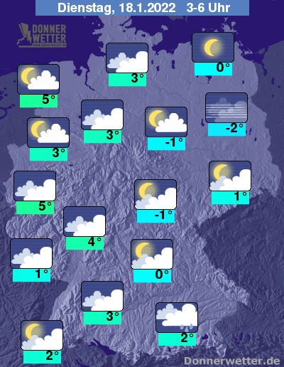 In der kommenden Nacht fällt über Bayern zeitweise Regen oder Schnee, wobei sich die Niederschläge bis zum Morgen immer weiter auf den Alpenrand zurückziehen. Über dem Osten und Nordosten ist der Himmel meist sternenklar, sonst ist es überwiegend stark bewölkt oder neblig-trüb, jedoch bleibt es weitgehend trocken. Die Temperatur sinkt auf 5 Grad im Rheinland und bis -2 Grad im südlichen Brandenburg.