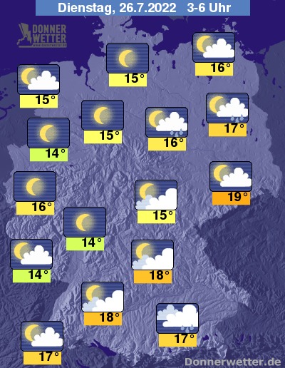 In der kommenden Nacht zeigt sich der Himmel über dem Norden und Westen meist sternenklar oder gering bewölkt, dazu bleibt es trocken. Dagegen hält sich über der Südosthälfte Deutschlands überwiegend starke, teils zieht auch lockere Bewölkung durch. Im Osten und an den Alpen können sich gebietsweise Schauer, selten auch Gewitter bilden. Die Temperatur sinkt auf 19 Grad in der Lausitz und bis 14 Grad im Münsterland.