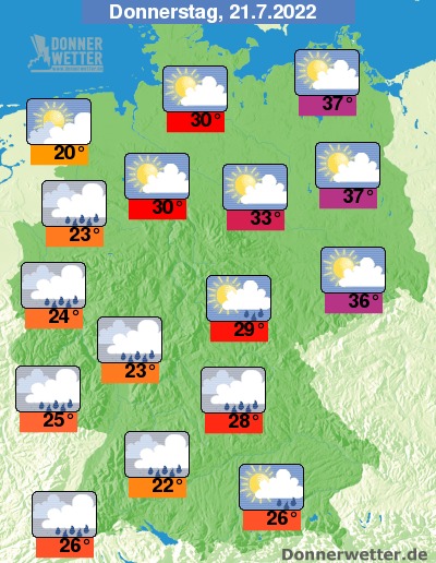 Am Donnerstag ist es im Norden und Osten meist heiter und es trocken. Weiter nach Südwesten hin ziehen dagegen meist dichte Wolken durch und es bilden sich vielerorts Schauer. Zudem bilden sich auch örtliche, teilweise schwere Gewitter. Die Temperatur erreicht 20 Grad direkt an der Nordsee und bis zu 37 Grad in Berlin.